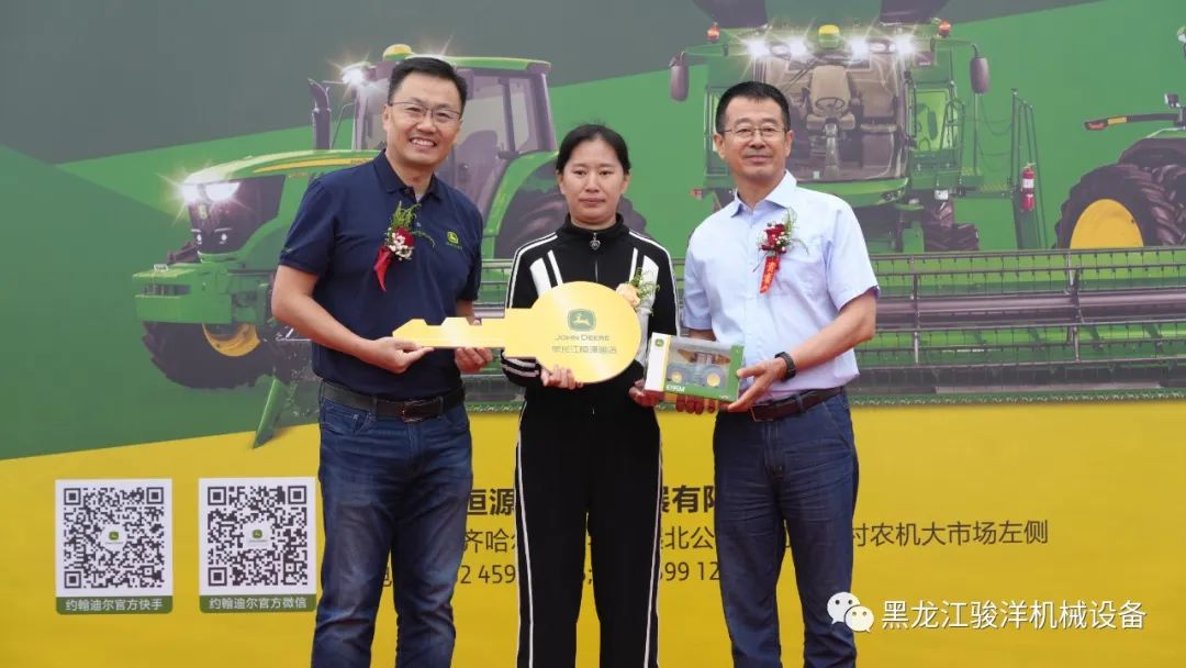 隨后,約翰迪爾領(lǐng)導(dǎo)層為黑龍江恒源迪農(nóng)業(yè)開業(yè)剪彩并向用戶交付了8600青貯機、S760收割機和6M-2104拖拉機金鑰匙。